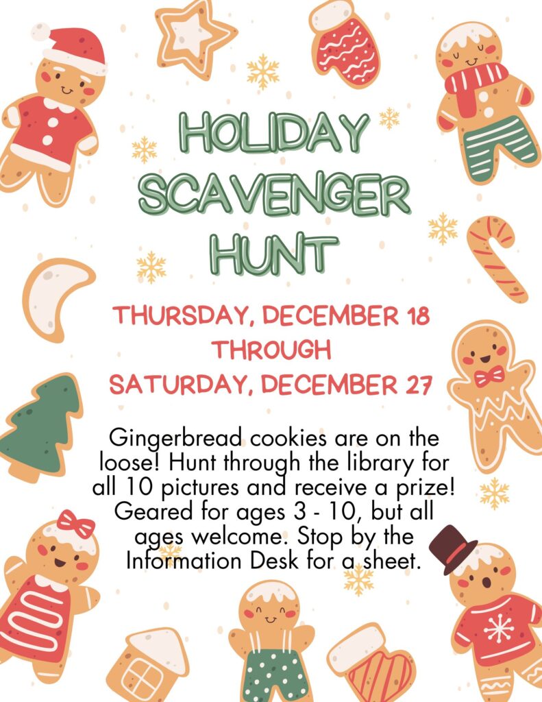 Gingerbread cookies are on the loose! Hunt through the library from Thursday, December 18 to Saturday, December 27 to find all 10 pictures and receive a prize! Geared for ages 3 – 10. No registration required.