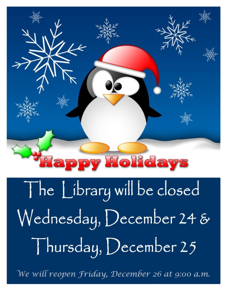 The library will be closed on 12/24 and 12/25 for the holidays. We will reopen on on Friday, December 26 at 9:00 AM.