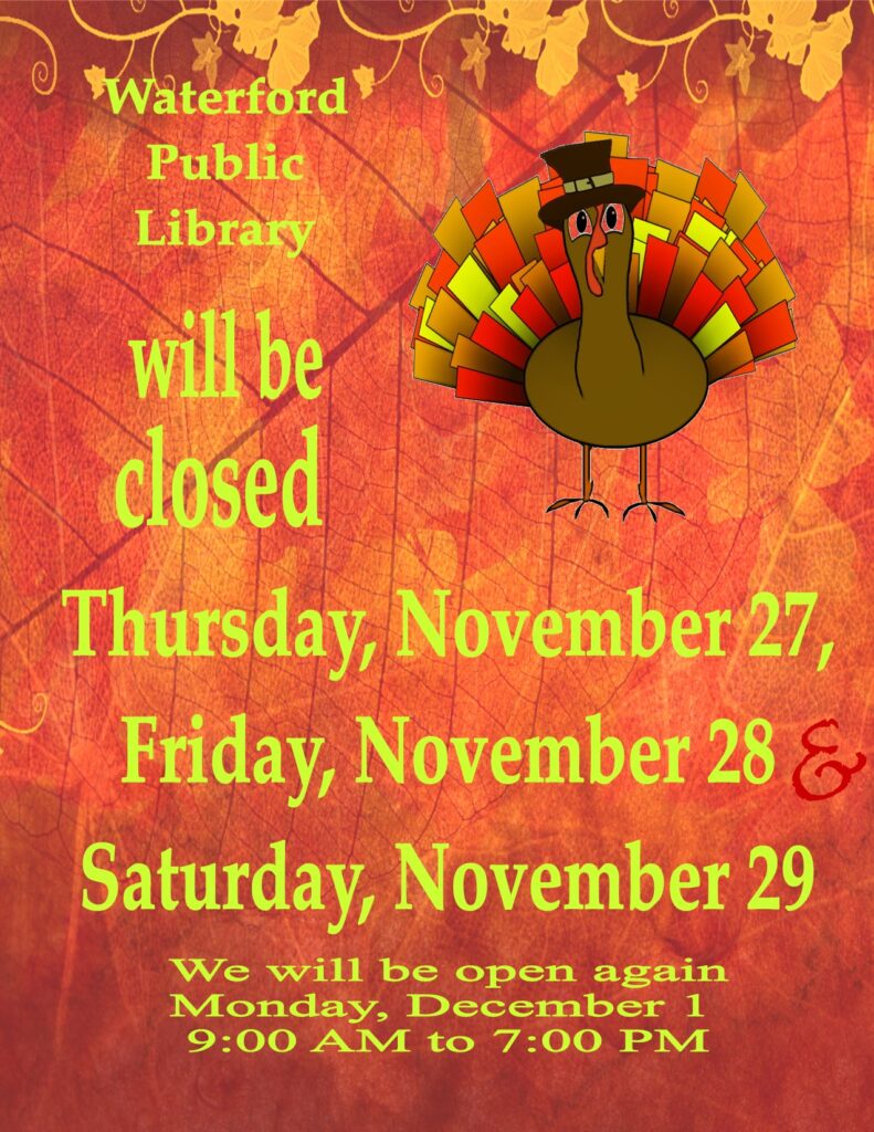 The Waterford Library will be closed Thursday, November 27 – Saturday, November 29 for Thanksgiving. We will reopen on Monday, December 1 at 9:00 AM.