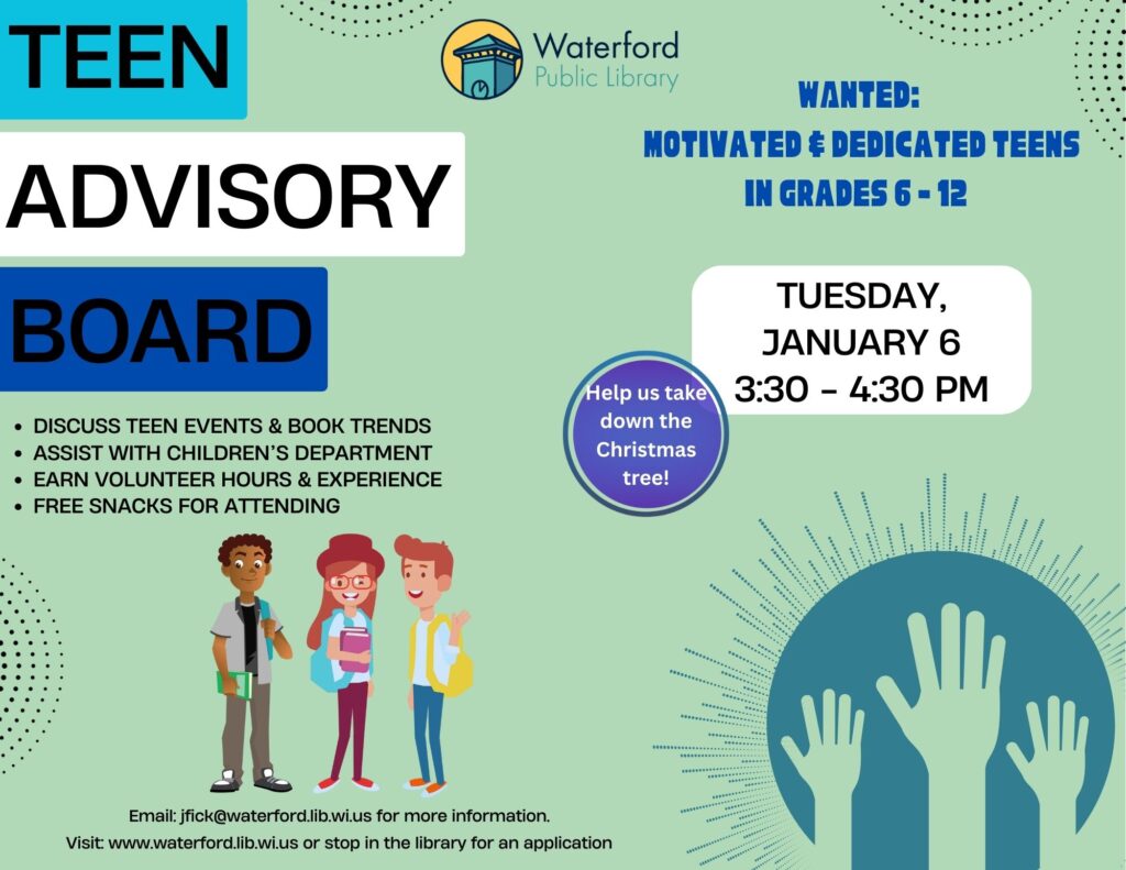 Teens in grades 6 – 12 are encouraged to join this group! Receive volunteer hours for attending meetings. Help us take down the Christmas tree on Tuesday, January 6 from 3:30-4:30 PM. No registration required.