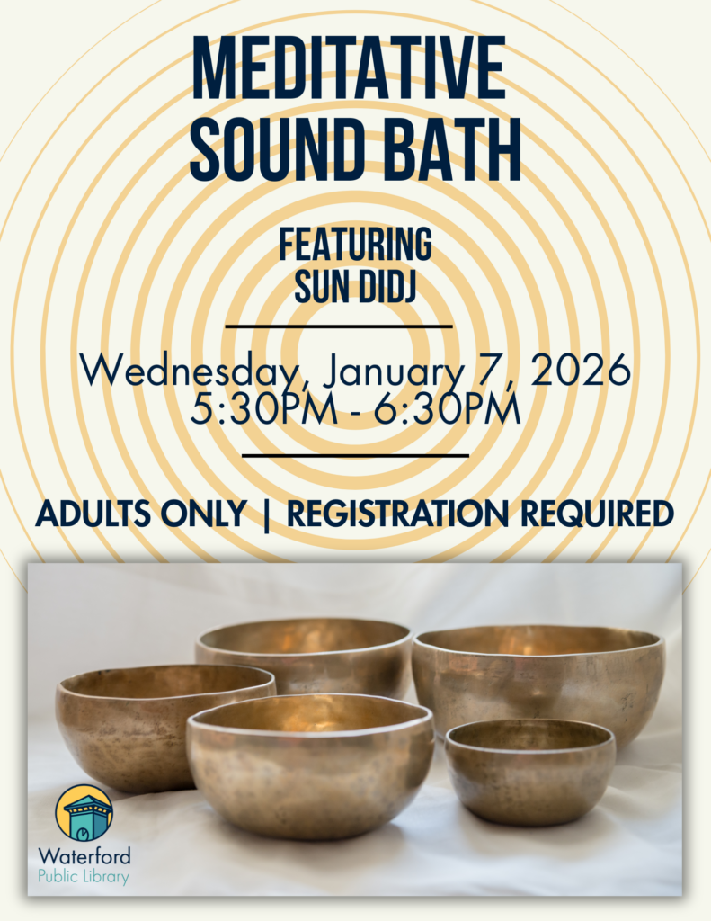 **This class is full.** Join us at the Waterford Public Library on Wednesday, January 7 at 5:30 PM for an immersive evening of deep relaxation and renewal. Local musician and community artist Sun Didj will guide participants through a meditative sound bath, weaving together resonant tones, gentle rhythms, and layered vibrations designed to quiet the mind and restore balance. No prior experience needed — simply bring your curiosity and a willingness to rest in sound. Yoga mats available or bring your own.