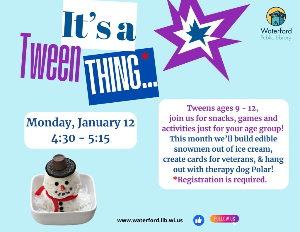 Tweens ages 9 – 12, join us for activities just for your age group! On Monday, January 12 at 4:30 PM create ice cream snowmen, make cards for veterans, and hang out with therapy dog Polar! Registration required.