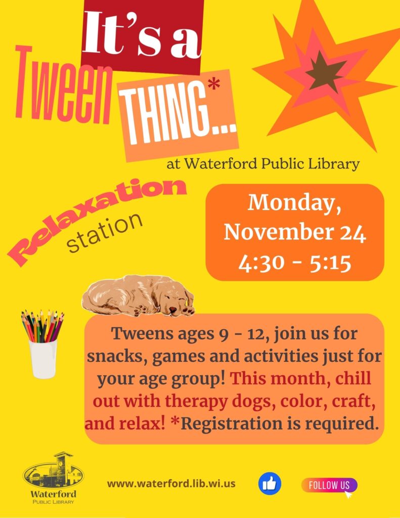 Tweens ages 9 – 12, join us for activities just for your age group. On Monday, November 24 from 4:30 – 5:15 PM, we’ll chill out with therapy dogs, coloring and other relaxing activities. Registration required.