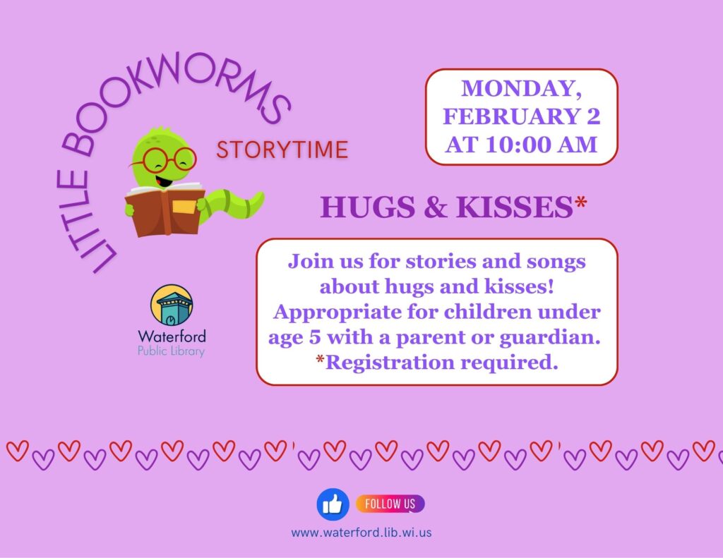 Join us for stories and songs all about hugs and kisses on Monday, February 2 at 10:00 AM! Appropriate for children under 5 with a caregiver.