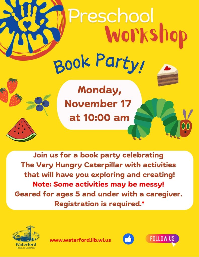 Join us for a book party celebrating The Very Hungry Caterpillar with activities that will have you exploring and creating on Monday, November 17 at 10:00 AM! Geared for ages 5 and under with a caregiver. Registration required.
