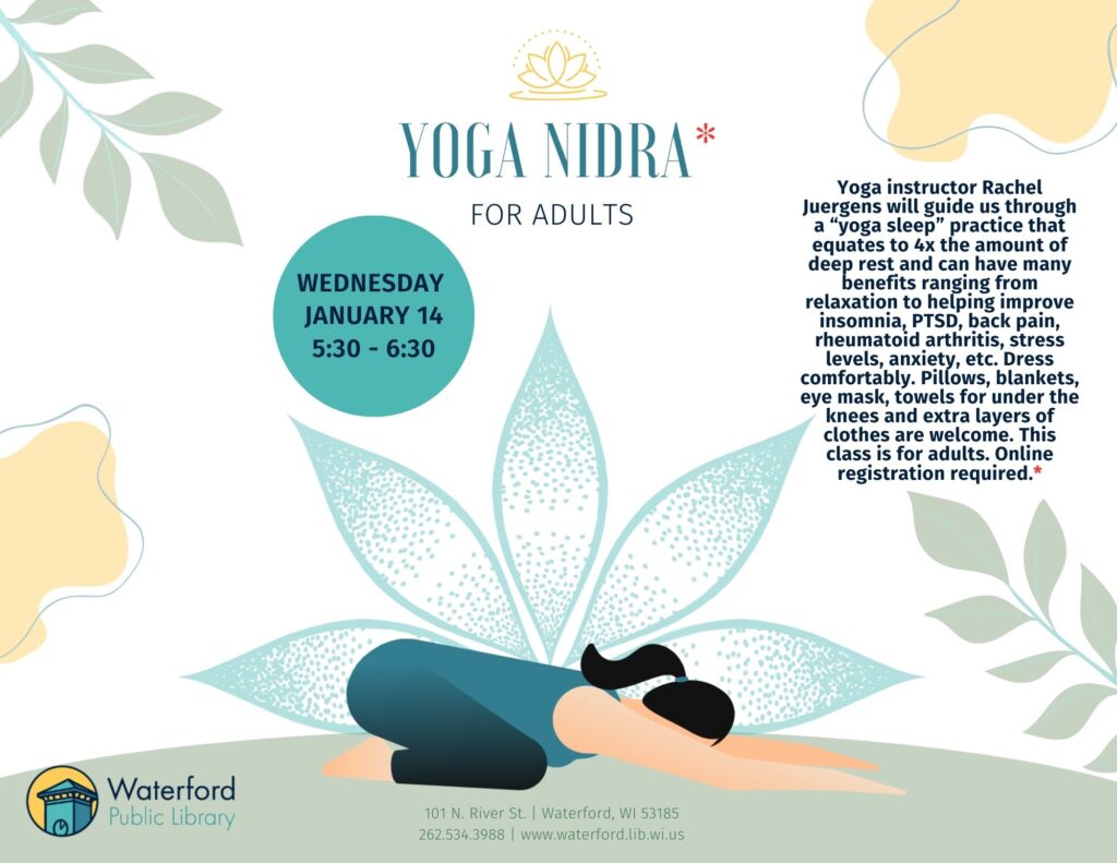 Yoga instructor Rachel Juergens will guide us through a “yoga sleep” practice that equates to 4x the amount deep rest, and can have many health benefits on Wednesday, January 14 at 5:30 PM. Adults only. Registration required.